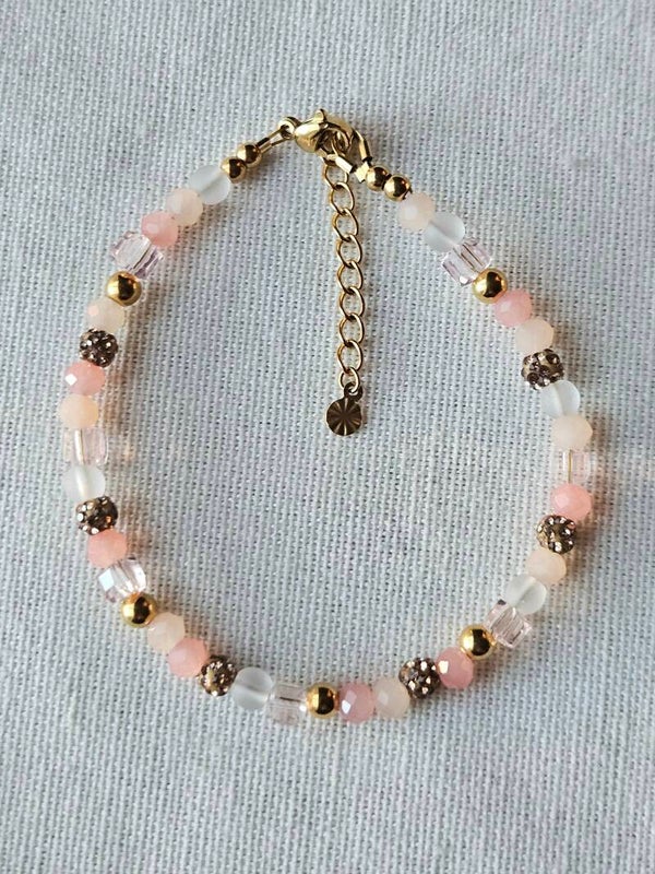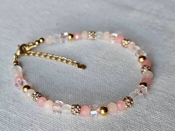 Deze verfijnde armband is met zorg handgemaakt door Beads by DEB en bestaat uit facet geslepen glas kralen in warme roze tinten, gecombineerd met verguld stainless steel kralen en onderdelen die niet verkleuren en allergievrij zijn. Het ontwerp heeft een maat van 16 cm met een 3 cm verlengketting, waardoor de armband verstelbaar is en comfortabel om de pols past.