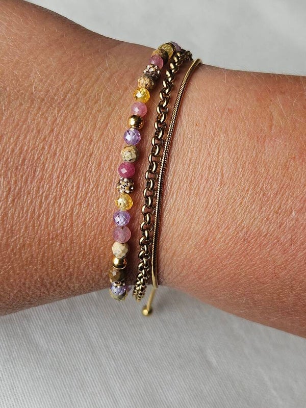 De Sparkle & Shine armband combineert 4 mm facetkralen, pink tourmaline edelstenen en verguld stainless steel. De fijne facetten vangen het licht subtiel – een tijdloos sieraad dat elke outfit laat schitteren.