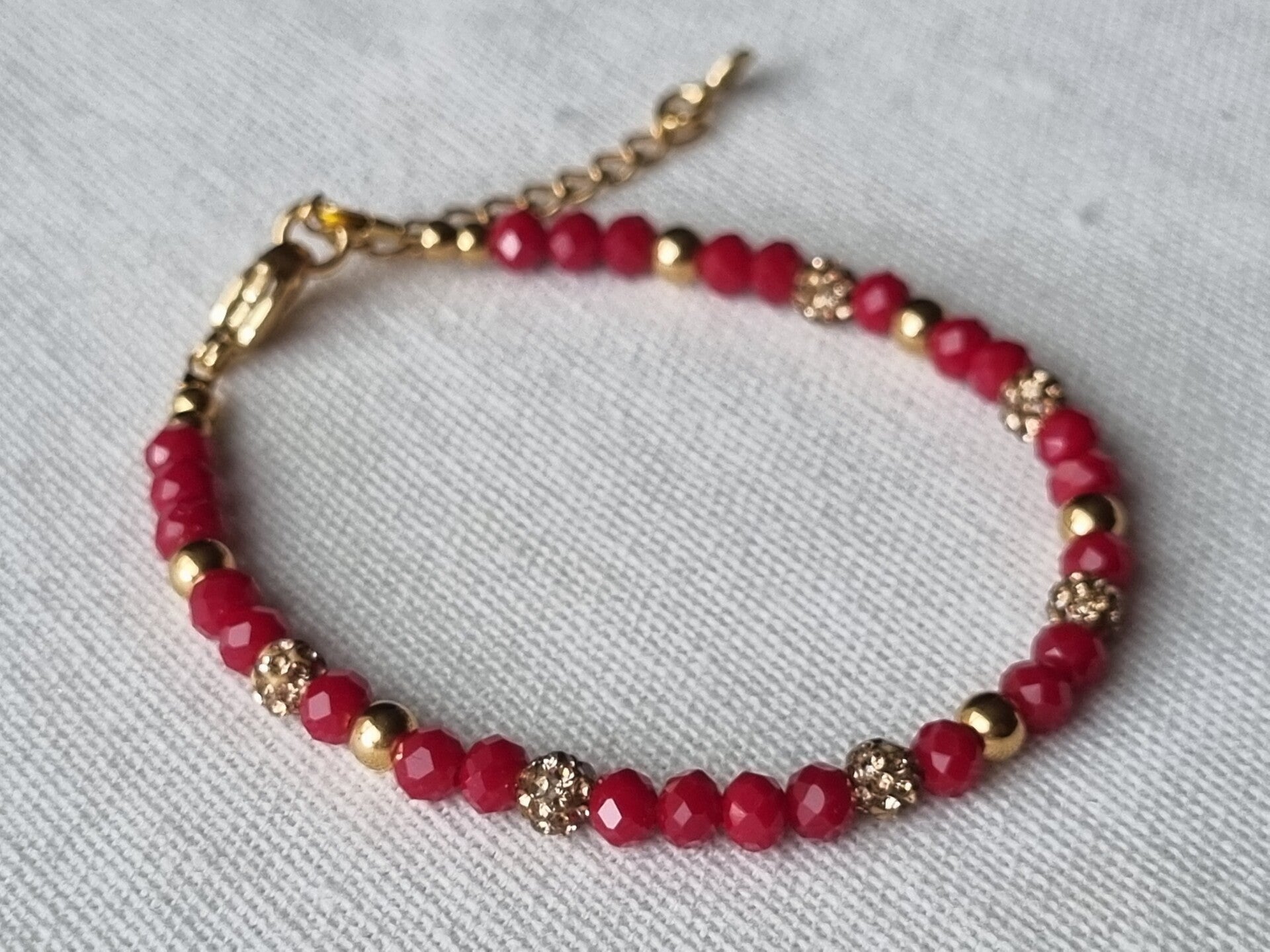 Prachtige armband, perfect voor de feestdagen! Deze stijlvolle armband combineert rode glasfacetkralen met glanzende gouden stainless steel kralen. De onderdelen zijn verkleurbestendig en allergievriendelijk. Lengte 15 cm met 3 cm verlenging, kralen van 4 mm. Een sprankelend sieraad dat elke outfit extra feestelijk maakt.