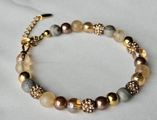 Gemaakt van verschillende edelstenen waaronder citrien. Met prachtige shamballa glitterkralen.