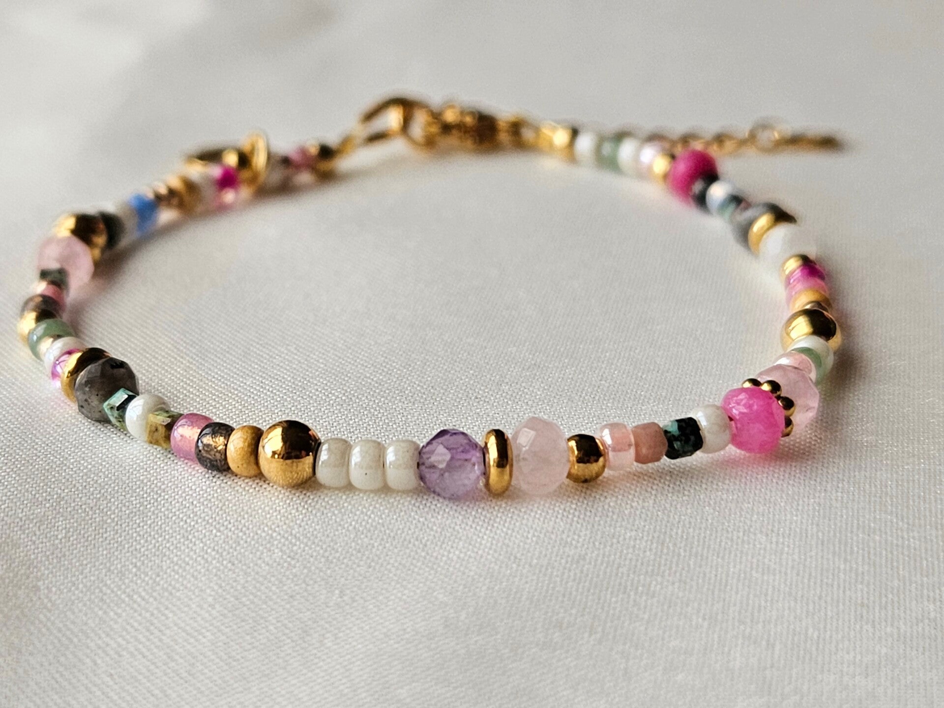 Dit toffe enkelbandje is een echte blikvanger en past moeiteloos bij elke outfit – van zomerse jurken tot casual jeans. Gemaakt van een mix van edelstenen zoals roze kwarts, labradoriet, miyuki kralen en luxe 18k vergulde stainless steel kralen en spacers.