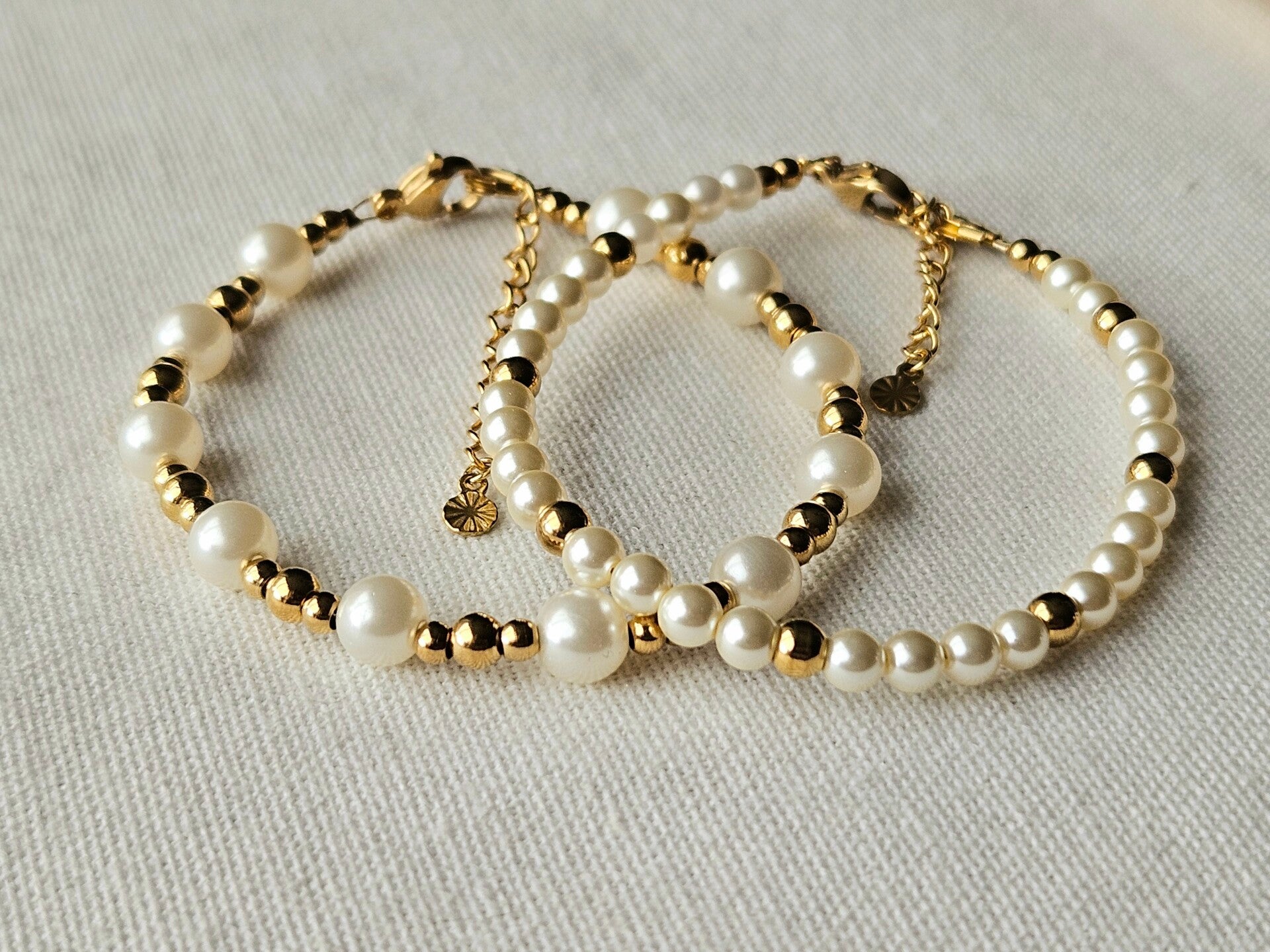 Prachtige armband gemaakt van imitatie parels en verguld (gouden) stainless steel kralen en onderdelen.