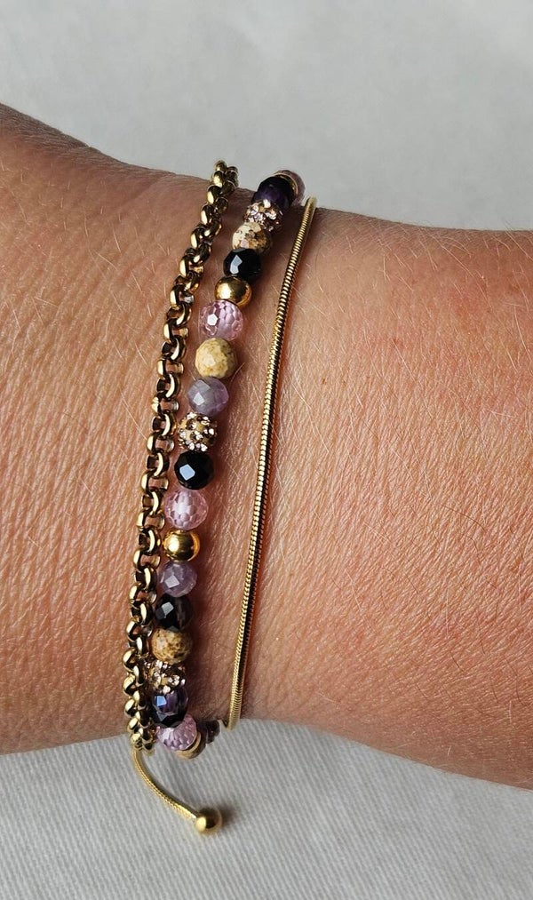 Deze armband combineert amethist, black stripe agaat en schitterende zirkonia kraaltjes, afgewerkt met een stainless steel slotje dat niet verkleurt. De 4 mm kralen en het verstelbare ontwerp (16 cm + 4 cm verlengstuk) maken het een veelzijdig sieraad dat bij elke gelegenheid past.
