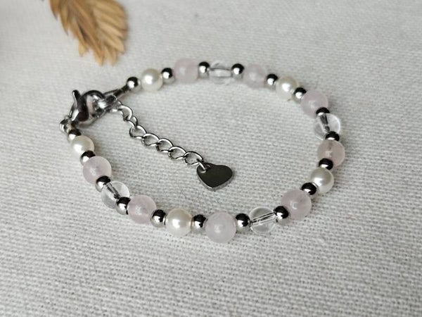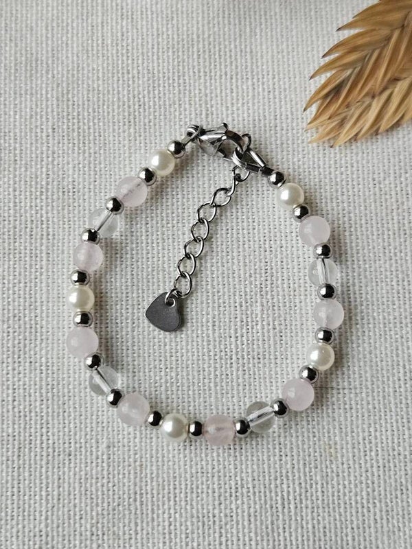 Laat kleine polsjes stralen met deze handgemaakte kinderarmband van Beads by DEB! 🌸 De roze rozenkwarts en glanzende glasparels geven een zachte, romantische uitstraling. De zilverkleurige stainless steel kralen en slotje verkleuren niet en zijn allergievrij. Met een verstelbare lengte van 12 cm + 3 cm verlengketting past deze armband perfect om de pols van een kind en groeit gemakkelijk mee. Een elegant en tijdloos sieraad dat elke outfit een subtiele luxe geeft. 🎀