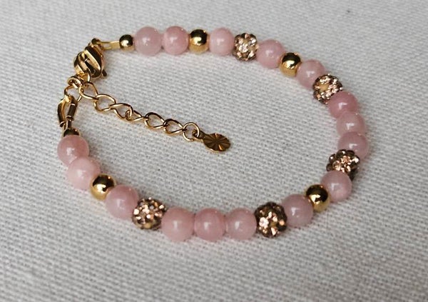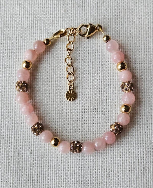Laat kleine polsjes stralen met deze handgemaakte kinderarmband van Beads by DEB! 🌟 De frisse jade edelstenen (4 mm) en fonkelende shamballa glitterkraal geven een vrolijke, speelse look. De verguld gouden kralen en het stainless steel slotje verkleuren niet en zijn allergievrij. Met de verstelbare lengte van 12 cm + 3 cm verlengketting past hij perfect om iedere kinderpols – een leuk sieraad voor elke dag! 🎀