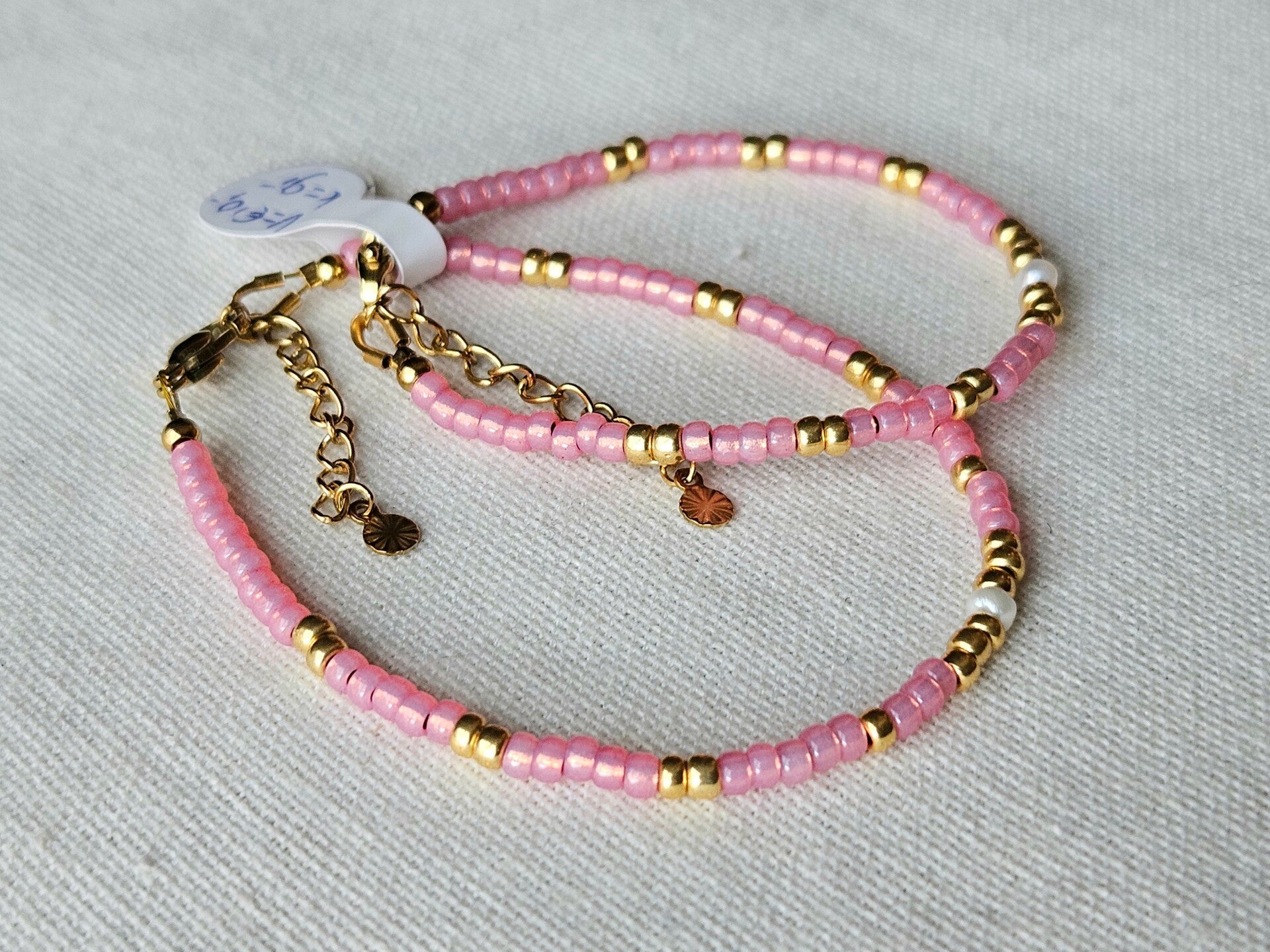 Handgemaakt door Beads by DEB met kleurvaste Miyuki kralen en afgewerkt met een prachtige zoetwaterparel. Het vergulde gouden stainless steel is sterk, huidvriendelijk en blijft mooi.