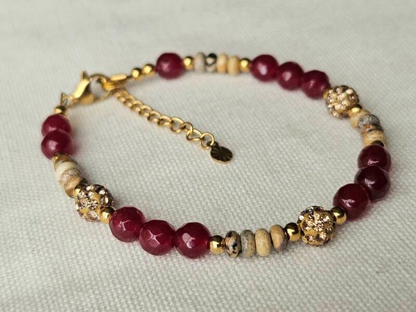 Deze armband van Beads by Deb combineert Calderón rode smaragd, picture jasper én sprankelende glitterkralen voor een subtiel en krachtig effect. Verfijnd, warm en vol energie — ideaal voor in combinatie met je favoriete sieraden.