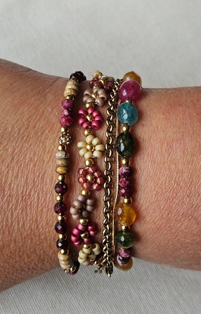 Deze armbandenset brengt direct warmte en stijl om je pols. De diepe tinten bordeauxrood en bruin worden gecombineerd met natuurlijke edelstenen toermalijn en picture jaspis. De vrolijke Miyuki rocailles in bloemvorm geven de set net dat speelse accent.