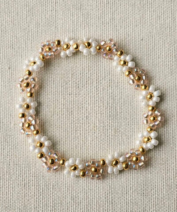 Met de hand geregen van fijne Miyuki glaskralen in een vrolijk bloemetjespatroon. De elastische band zorgt voor een perfecte pasvorm — licht, comfortabel en ideaal om te combineren met je andere favoriete sieraden.