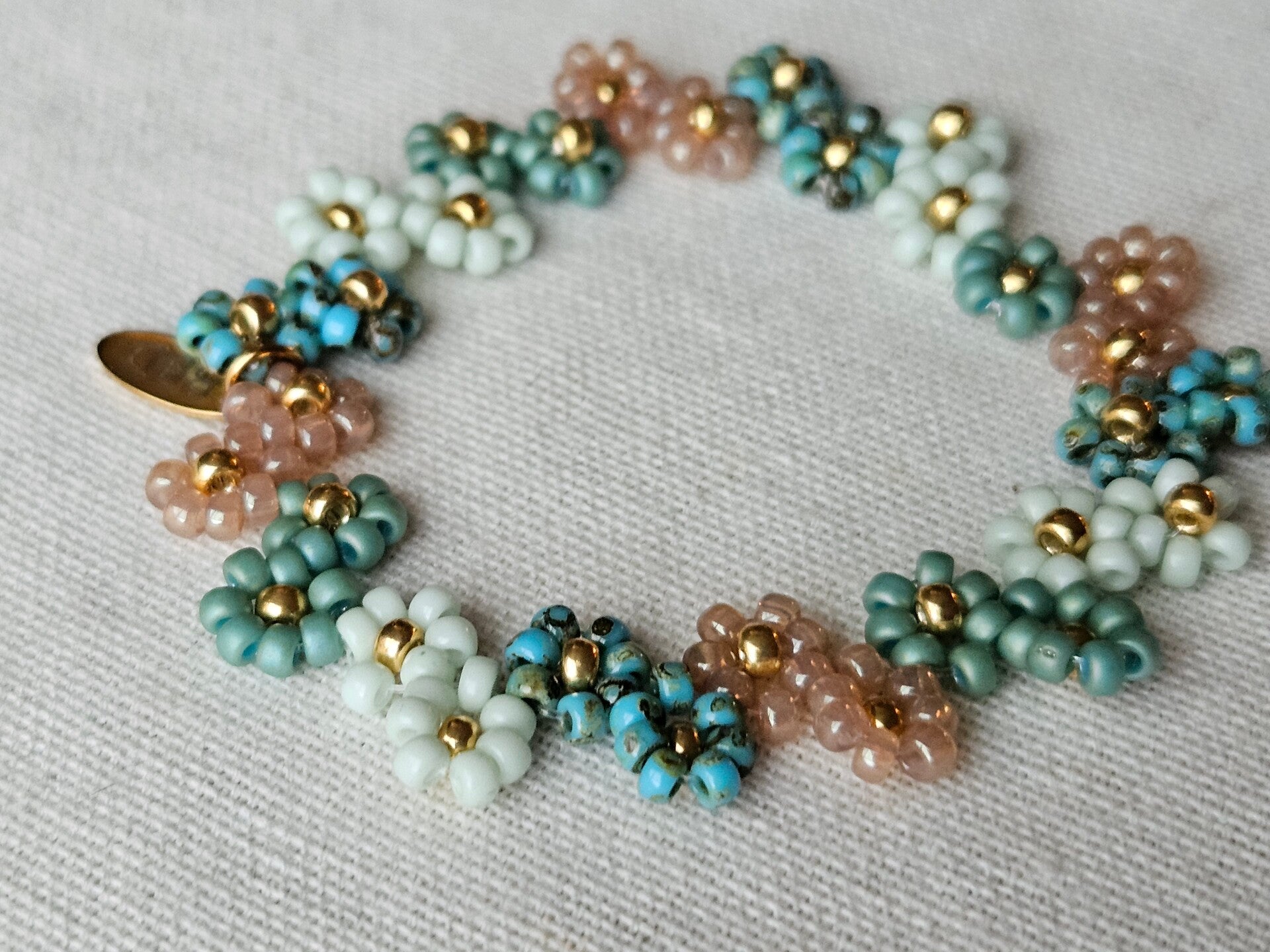 Met de hand geregen van fijne Miyuki glaskralen in een vrolijk bloemetjespatroon. De elastische band zorgt voor een perfecte pasvorm — licht, comfortabel en ideaal om te combineren met je andere favoriete sieraden.