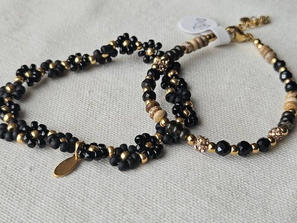 De combinatie van een elastische bloemetjesarmband (maat 16 cm) en een edelstenen armband (maat 16 cm + 3 cm verlenging) maakt dit setje een echte blikvanger.
