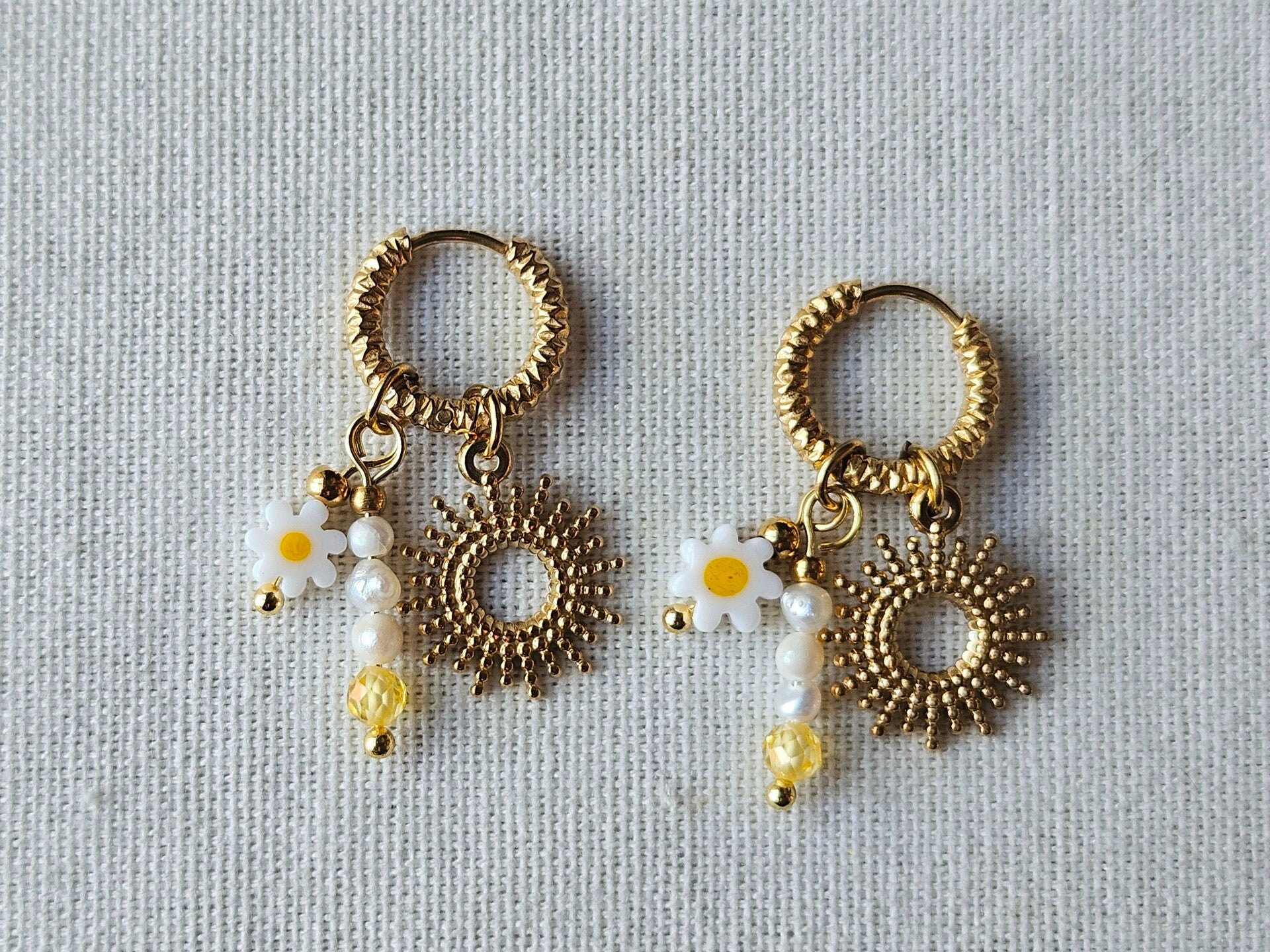 Verguld gouden Stainless steel oorbellen(18k). Gemaakt van zoetwaterparels en zirkonia facet kralen met een prachtig stainless steel zon